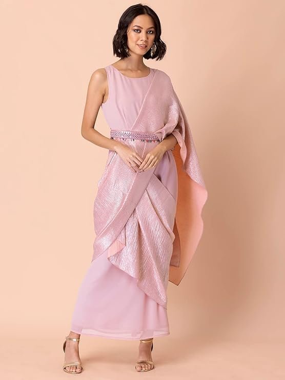 - Blush silver pre-stitched saree tailored in crepe and georgette. It features an attached pleated pallu with an embellished tie-up belt finished with beads. Tailored sleeveless, it is designed with a round neck and has a zip closure.