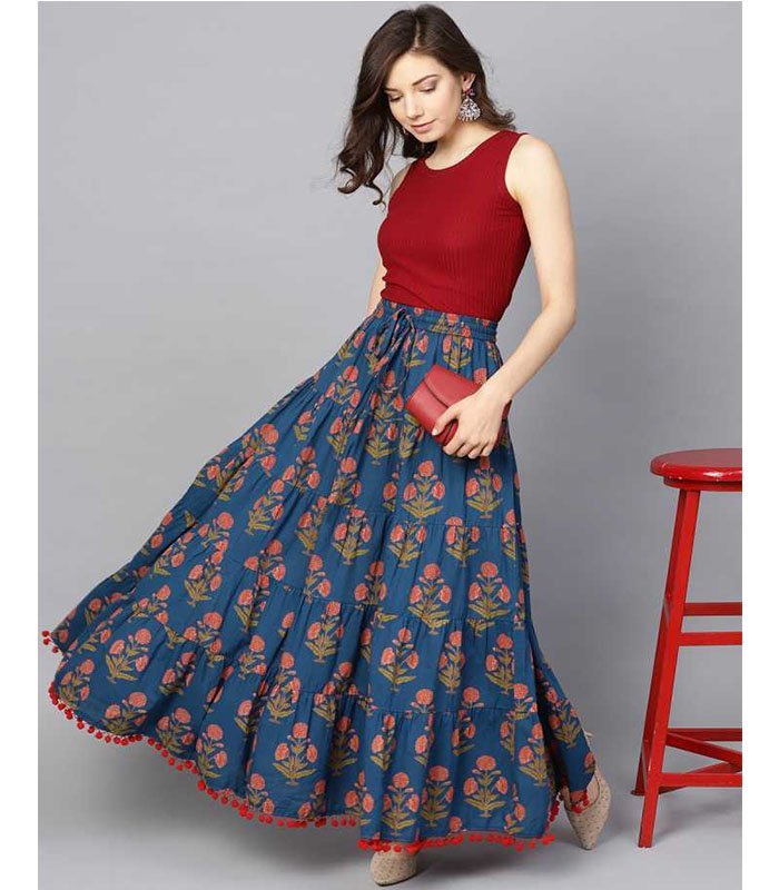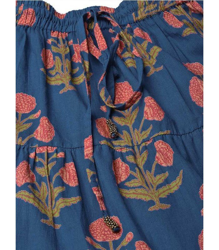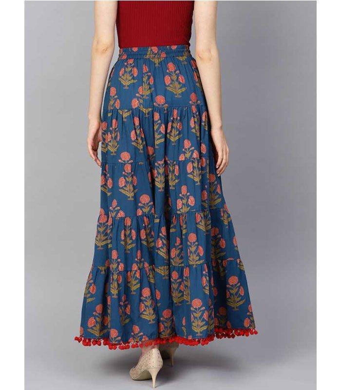 blue floral printed tiered skirt with drawstring and tassels at waist band with pom-pom lace at hemline, all over elasticated waist band with dori and tassel detailing