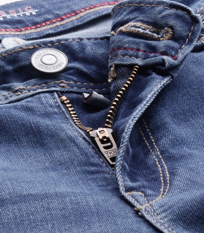 - Zip fly with button closure.